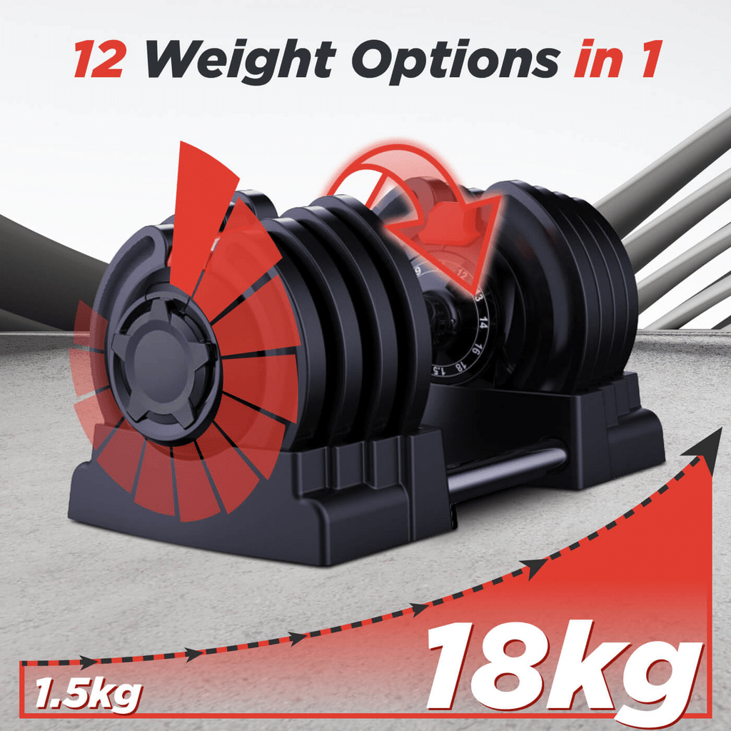 The weights go from 1.5kg to 18kg making it suitable for training all muscle groups and sharing with your loved ones. Be it heavy duty muscle building or lightweight fat-burn training, this dumbbell is all it takes.