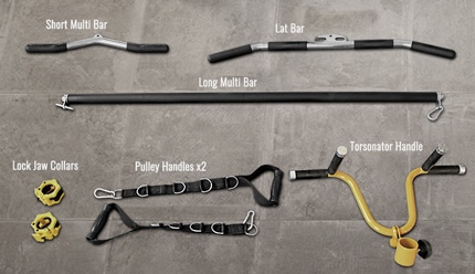 Comes with h 2 dip attachments that are attached at the front of the machine. The super heavy frame allows you to perform pull ups & chin ups without worrying about the machine tipping over or shifting under your bodyweight.