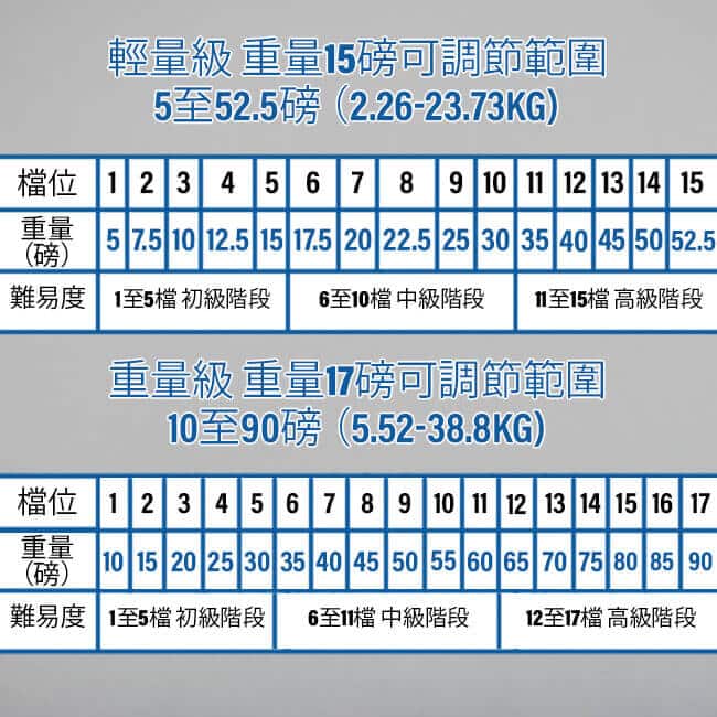 | 重量 | 輕量級 (5-52.5 lbs) x 1, 輕量級 (5-52.5磅) x 2, 重量級 (10-90磅) x 1, 重量級 (10-90磅) x 2 |